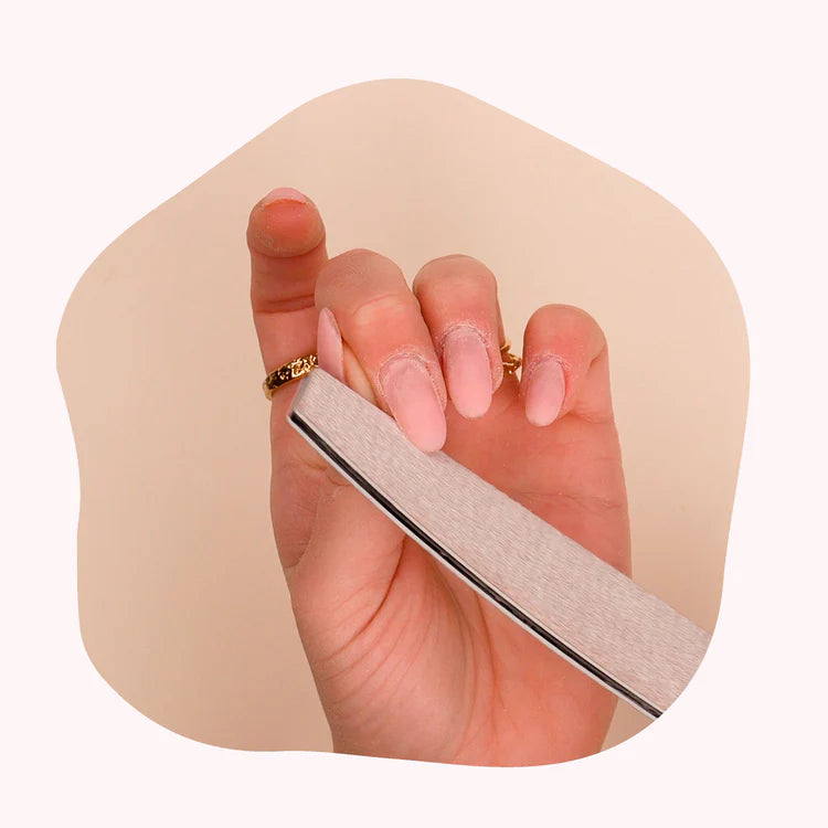 Börja mattningen från slutet av nageln och arbeta mot nagelspetsen. Det är viktigt att matta naglarna med omsorg och lätt hand. Om du mattar för hårt eller grovt riskerar du att skada din nagelplatta.